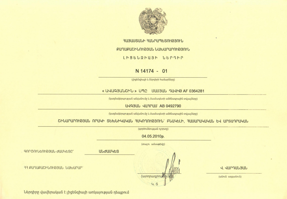՛՛Ավագյանշին՛՛ ընկերությունը շինարարական շուկայում է շուրջ 32 տարի,որի ընթացքում ավարտին է հասցրել 500-ից ավել օբյեկտների շինարարություն:Ընկերությունը զբաղվում է նաև տարբեր բարդության աշխատանքների տեխնիկական հսկողությամբ:Ընկերությունում աշխատում են միայն բարձր պատրաստվածություն անցած և մեծ աշխատանքային փորձ ունեցող աշխատակիցներ:՛՛Ավագյանշին՛՛ ընկերությունը ունի համապատասխան լիցենզիաներ՝ կատարելու ցանկացած շինարարական աշխատանք: